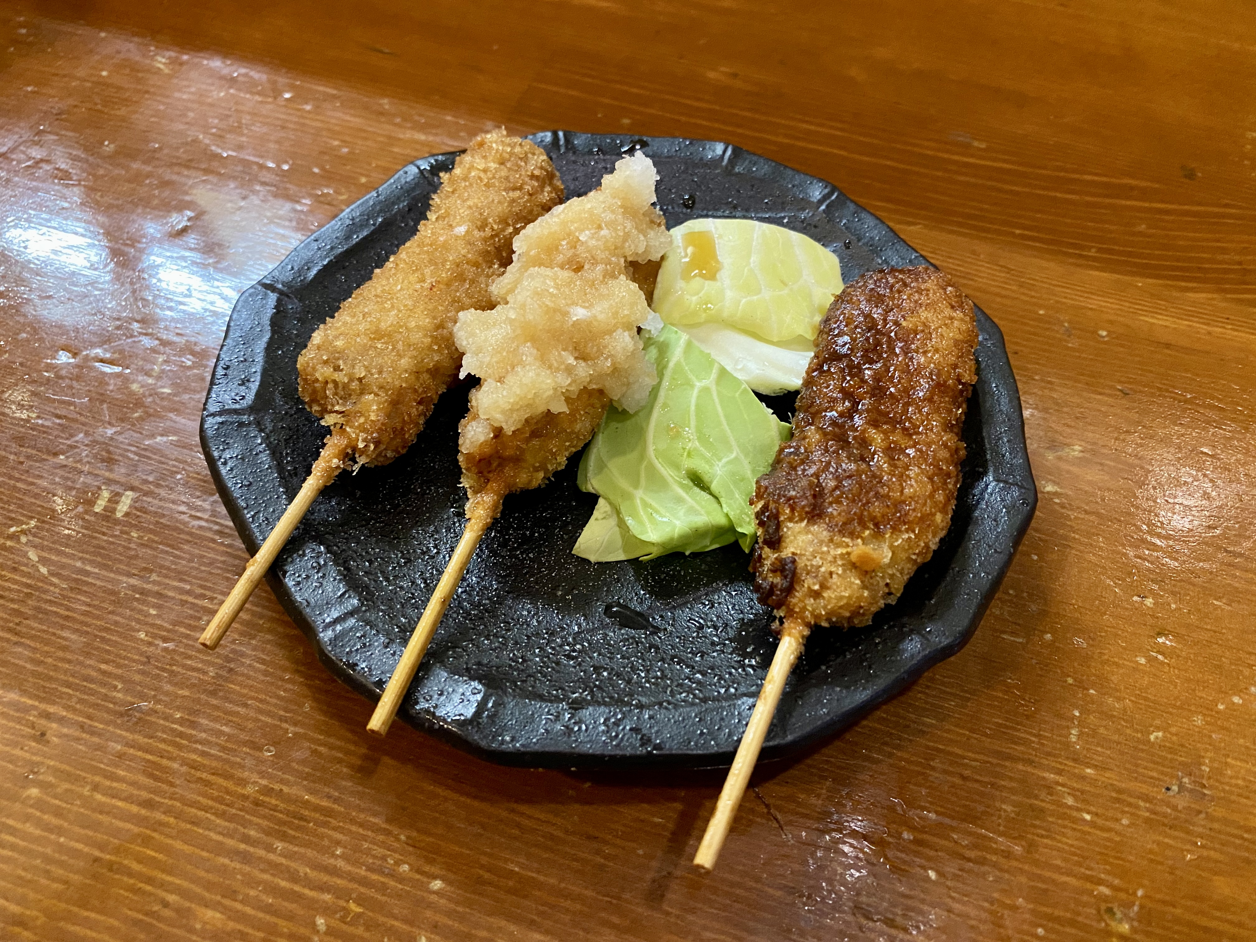 自家製の串カツや唐揚げ、大人気のシロコロホルモン。